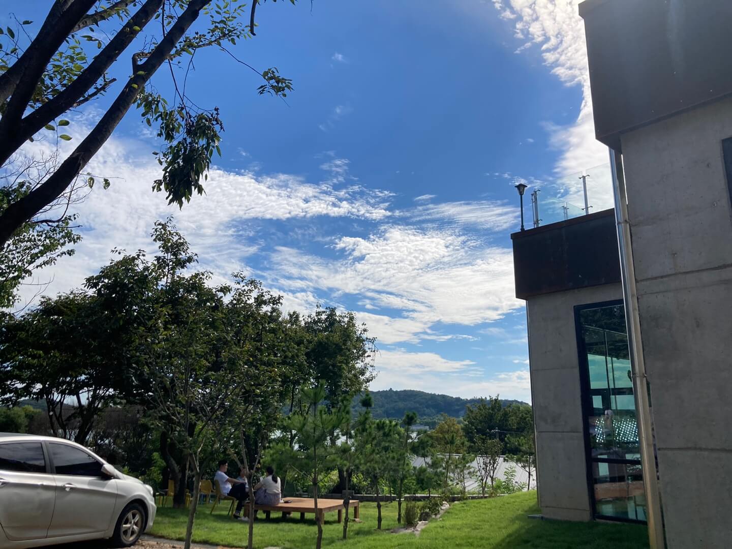 새로 생긴 고양 한강공원 근처 행주산성 음식문화거리에 위치한 <카페 다르모>는 단층 노출 콘크리트 구조물에 루프탑은 패널로 마감한 외관을 하고 있습니다. 정원 형식의 조경을 잘 꾸며 놓고 통창을 써서 실내에서 시야가 좋은 편이며, 야외에도 자리를 마련해 두어 날씨가 좋은 날에는 실외에서 즐기는 분위기도 상당할 듯합니다. 인테리어는 외관과 잘 매칭 되도록 콘크리트에 벽체만 미장 마감을 하여 차가운 느낌을 주고 있습니다. 인테리어보다 야외 조경에 집중할 수 있는 구조라고 보는 것이 좋을 것 같습니다.