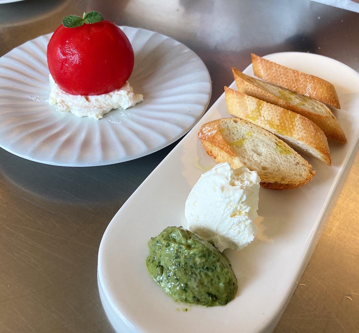 두번째로 나온 토마토카나페는 바게트 빵에 소스와 크림치즈 삶은 토마토를 곁들인 음식이었습니다. 특히 빵과 함께 플레이팅 된 소스의 맛이 좋았던 기억이 있습니다.