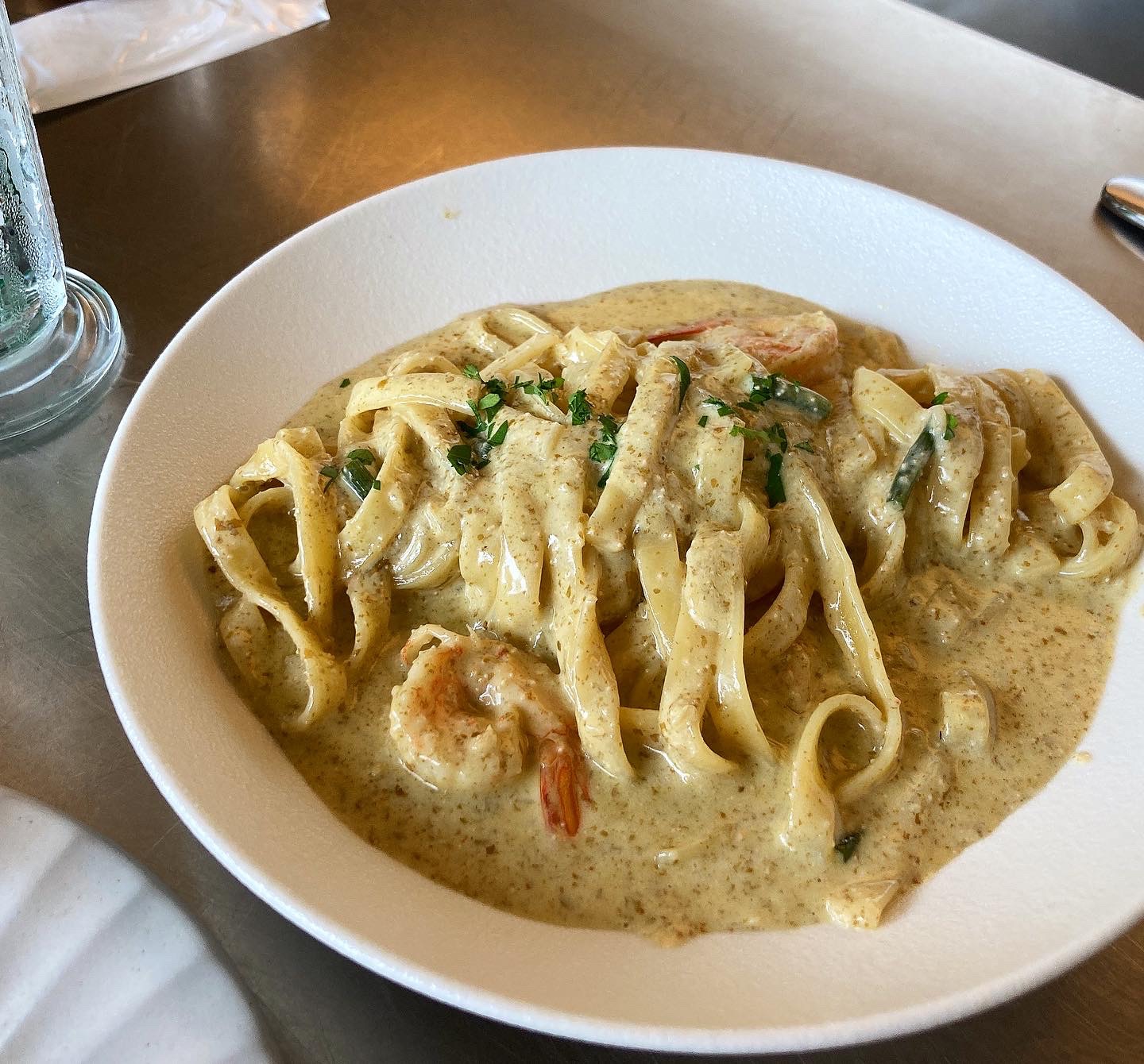 세번째 메뉴는 김명란크림파스타. 면의 익힌 정도도 좋았고 소스와 잘 명란크림소스가 맛있어서 소스까지 싹싹 긁어 먹었어요. 카나페의 빵은 리필이 가능하기 때문에 명란 소스와 곁들이는 것도 추천합니다.