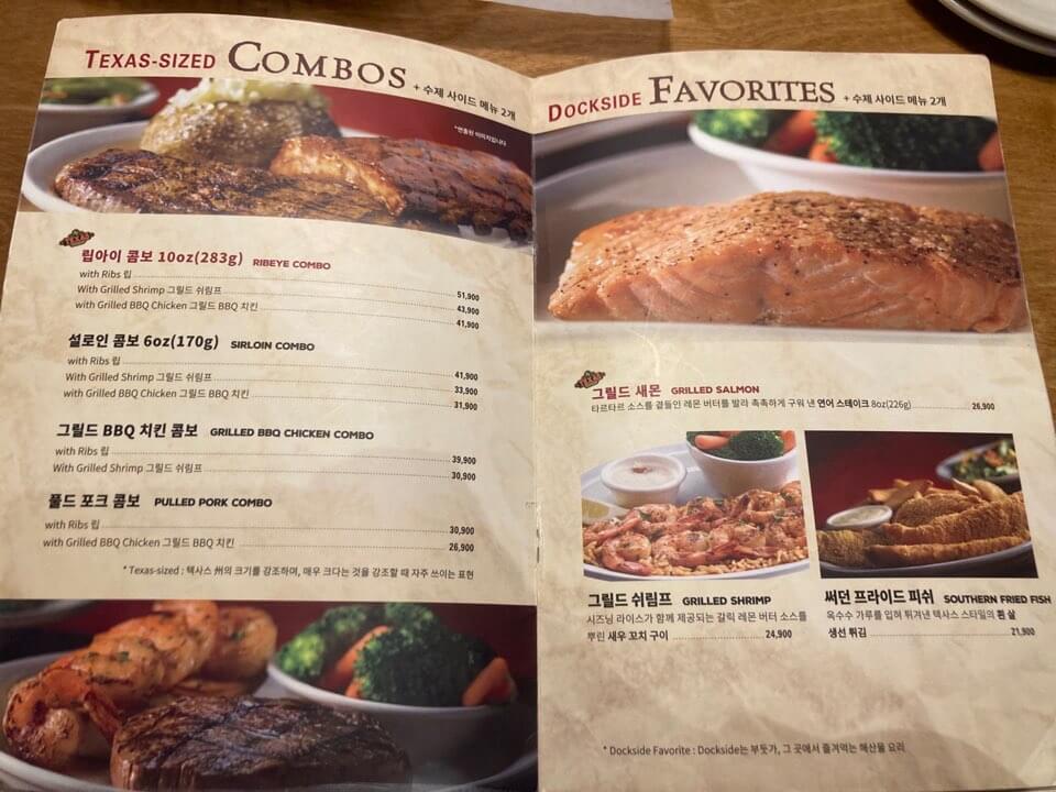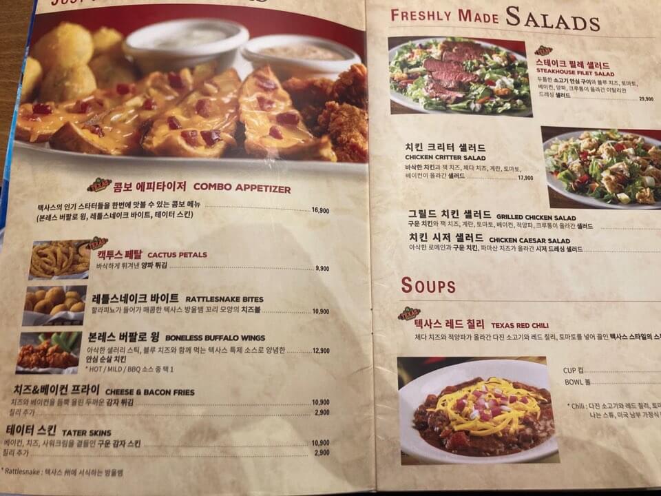 저희는 이번에 2인이 방문하여 설로인 스테이크 12oz, 콤보 애피타이저, 텍사스레드칠리 컵 사이즈를 주문하였습니다. <텍사스로드하우스>는 앞서 언급한 아웃백보다 선택폭이 좁은 편입니다. 대신 제한된 메뉴에서 소비자에게 최적화할 수 있는 부분들을 디테일하게 제공합니다.