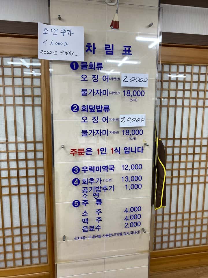 최근 식자재 가격이 상승하는 추세이다 보니 메뉴 가격에 변동이 잦은 편입니다. 이미 3회 정도 방문한 이력이 있는데 관광지 주변임을 고려하면, 성수기 바가지요금이라고 보기는 어렵고 단순히 가격 상승분을 반영한 것으로 보입니다. 근처 가게들이 연휴철, 휴가철에 비싸고 실속 없는 서비스 제공으로 질타를 받고 있는 것에 반해 적당한 가격으로 좋은 퀄리티의 음식을 제공합니다. 현재 오징어 가격이 많이 상승하여 컴플레인이 많아 오징어 물회는 판매를 중단한 상태입니다.