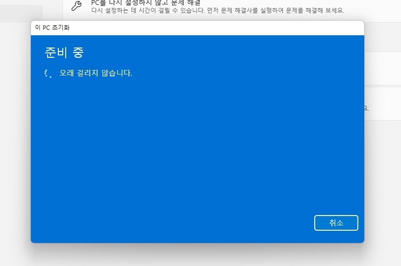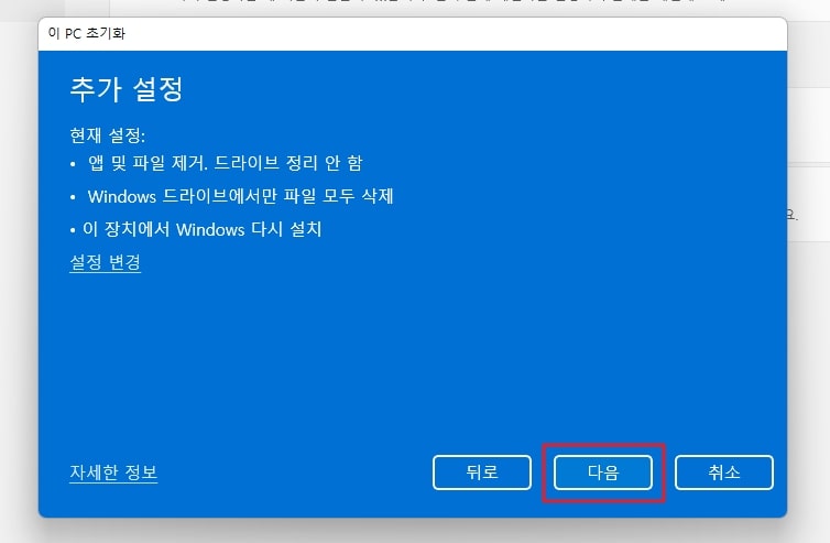마지막으로 다시 설정 버튼을 클릭하면 초기화가 시작됩니다. 이때 컴퓨터의 성능 등에 따라 소요시간에 차이가 있으나, 30분에서 1시간 정도가 소요된다고 생각하시면 편하실 것 같습니다.