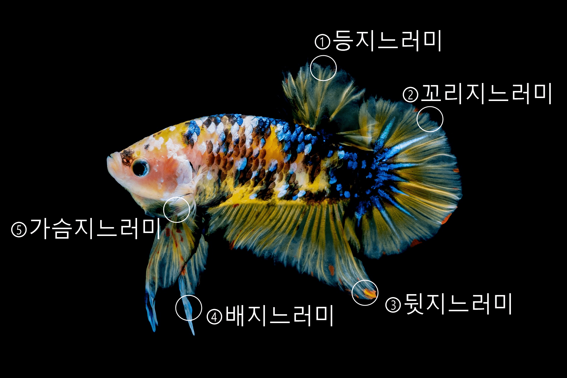 베타란 원래 등목어 목-버들붕어 과-베타 속에 속하는 어류 집단(약 75종)의 총칭이며, 우리가 흔히 동네 수족관이나 마트 수족관에서 볼 수 있는 베타는 캄보디아, 베트남, 태국 등 동남아시아가 원산지인 베타의 일종 ‘베타 스플렌덴스(Betta splendens)’를 관상용으로 개량한 것입니다. 이 글에서는 개량된 관상용 베타의 사육 준비부터 번식까지 알아보고자 하므로, 야생의 원종을 ‘야생 베타’, 관상용으로 개량된 것을 ‘관상용 베타’라 부르겠습니다. 관상용 베타의 신체적 특징에 대해 언급할 때 사용될 부위별 명칭은 다음과 같습니다.